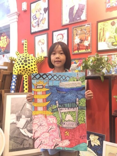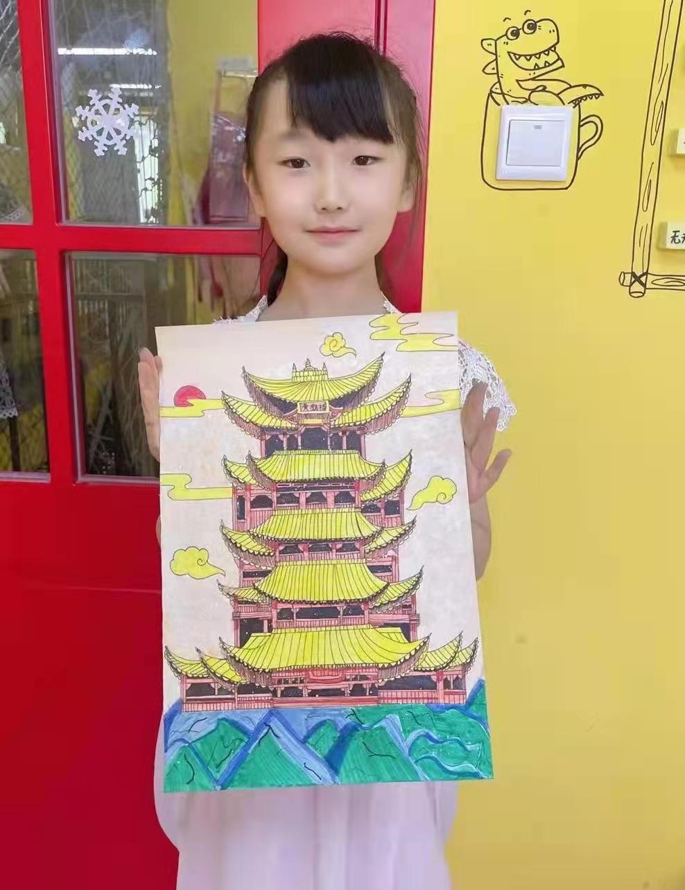 来自睿童美术的田丽媛老师介绍,班上有5个孩子参与了创作。他们将黄鹤楼、户部巷、长江等武汉地标注入创作中,观察细致,鲜艳的色彩,多样的武汉元素,能感受到孩子们对城市的由衷喜爱。“在创作时,孩子们联想到影片《厉害了我的国》,他们把在那里接收的荣誉感教育推及武汉,通过画笔表达‘厉害了我的武汉’,风景美丽,人民勇敢。”