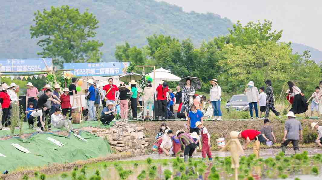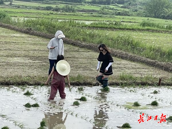 “天天吃大米,但我确实没见过稻米是怎么长出来的,所以一定要带孩子来看看。”家住武汉的刘静带着女儿在田里插秧,女儿在泥水里玩得不亦乐乎,和其他小朋友比赛谁插得更快;在春耕节上,戴着墨镜、身着裙子的时尚女士们穿上雨靴在稻田里一边插秧,一边拍照录视频打卡。