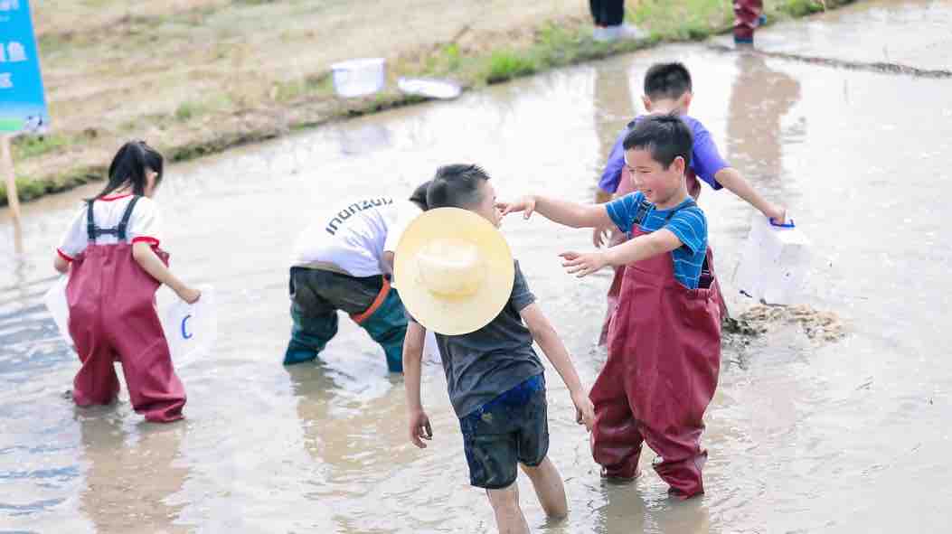 春耕节热闹起来,村里的孩子也赶来了,他们下到田里,跟城里孩子比赛摸鱼,你一条,我一条,孩子们抓到鱼放进桶里,家长们更是在田边一会儿递桶,一会儿忙着拍照,不亦乐乎。