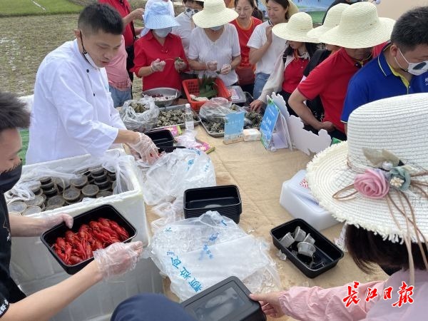 过节当然少不了美食,靓靓蒸虾、周黑鸭、二厂汽水、劲酒搭配国宝桥米包成的粽子,摆在田间地头的帐篷下,免费为村民和国宝桥米粉丝们提供。市民、村民敞开了吃,尽情地喝,吃饱喝足了,大家跳进水渠里,感受清凉,又忍不住打起了水仗。孩子们和大人你来我往,浑身湿透,好不热闹。