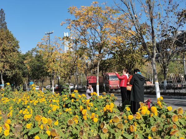 负责花田花海种植和养护的青山区花木公司负责人介绍,由于是第一次尝试在街头种植大片的向日葵和谷物,中间遇到过不少困难。向日葵种植了两个品种,泡芙和法兰西。八月中旬首次播种时遇到连日降雨,完全不发芽,后续又播种两次,发芽率仍不理想。他们只好改变思路,先在苗圃播种,待出芽后再移栽到街头空地上种植才有了这样的景观效果。谷物为小米,相对来说更易成活,但九月干旱少雨,在生长季浇水量倍增。两者相加面积共4500平方米。