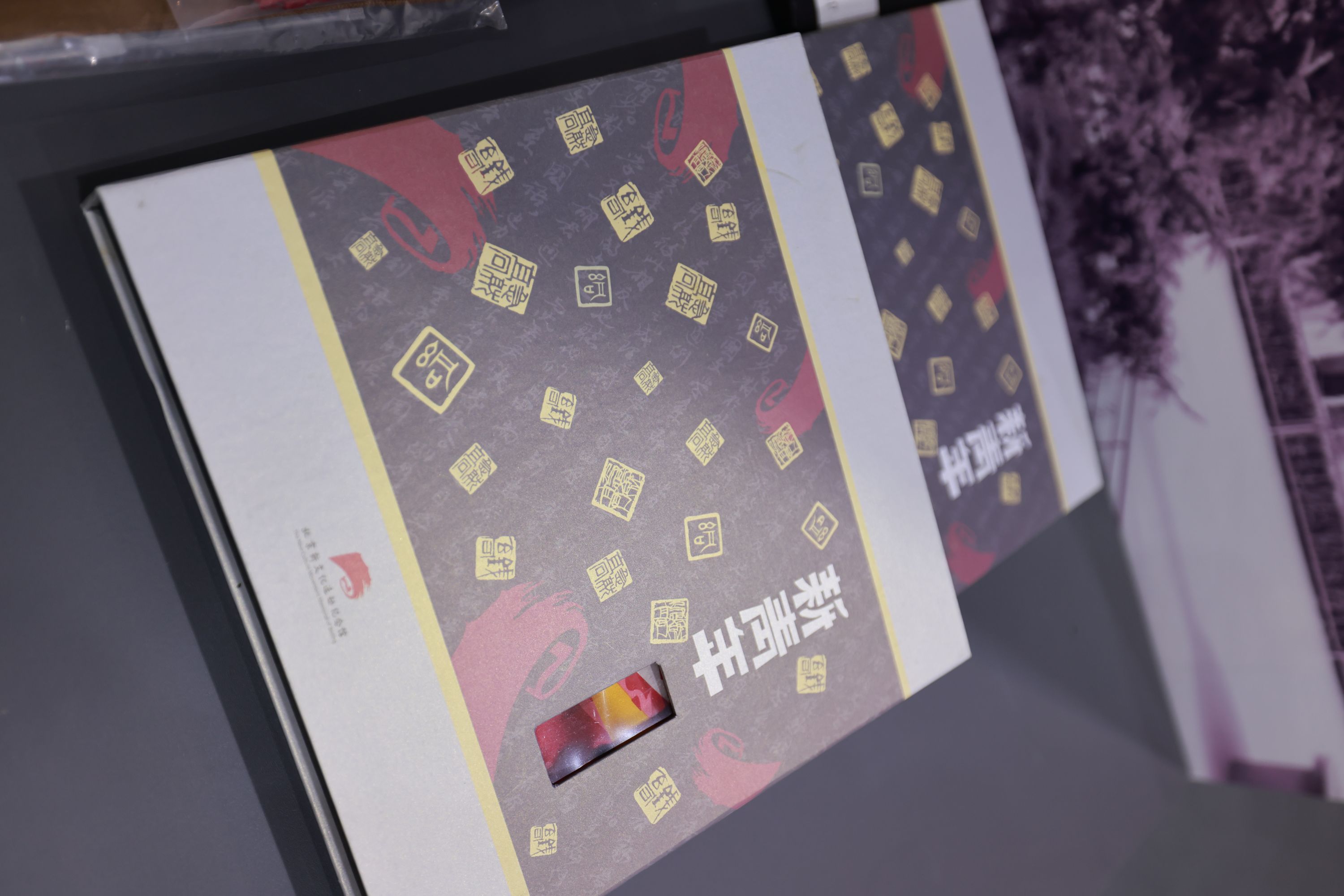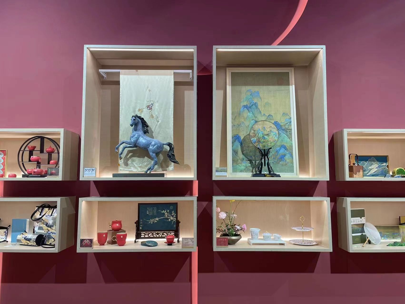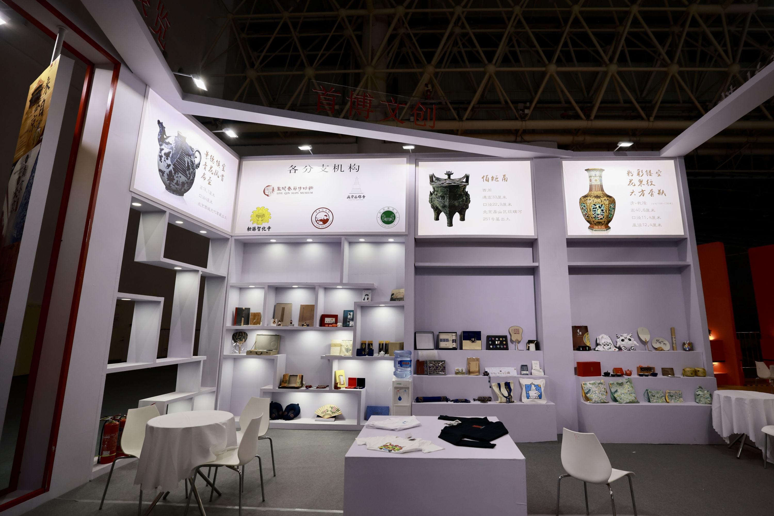 一系列周边文创产品也在现场展示,包括文件夹、双肩包、丝巾、茶具套装等。