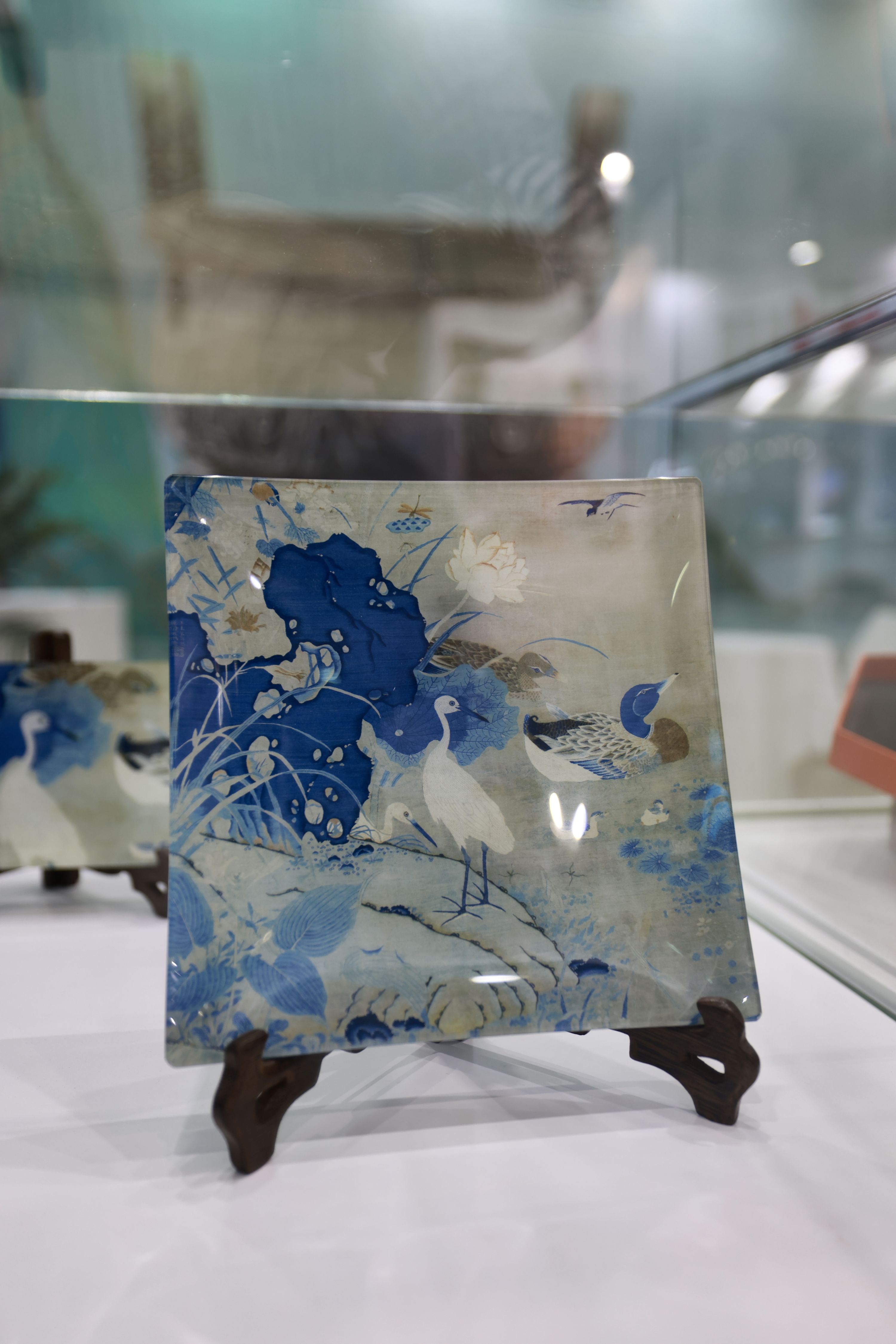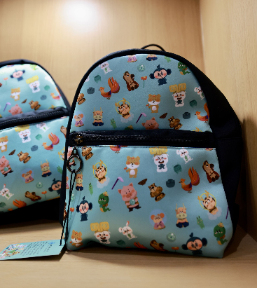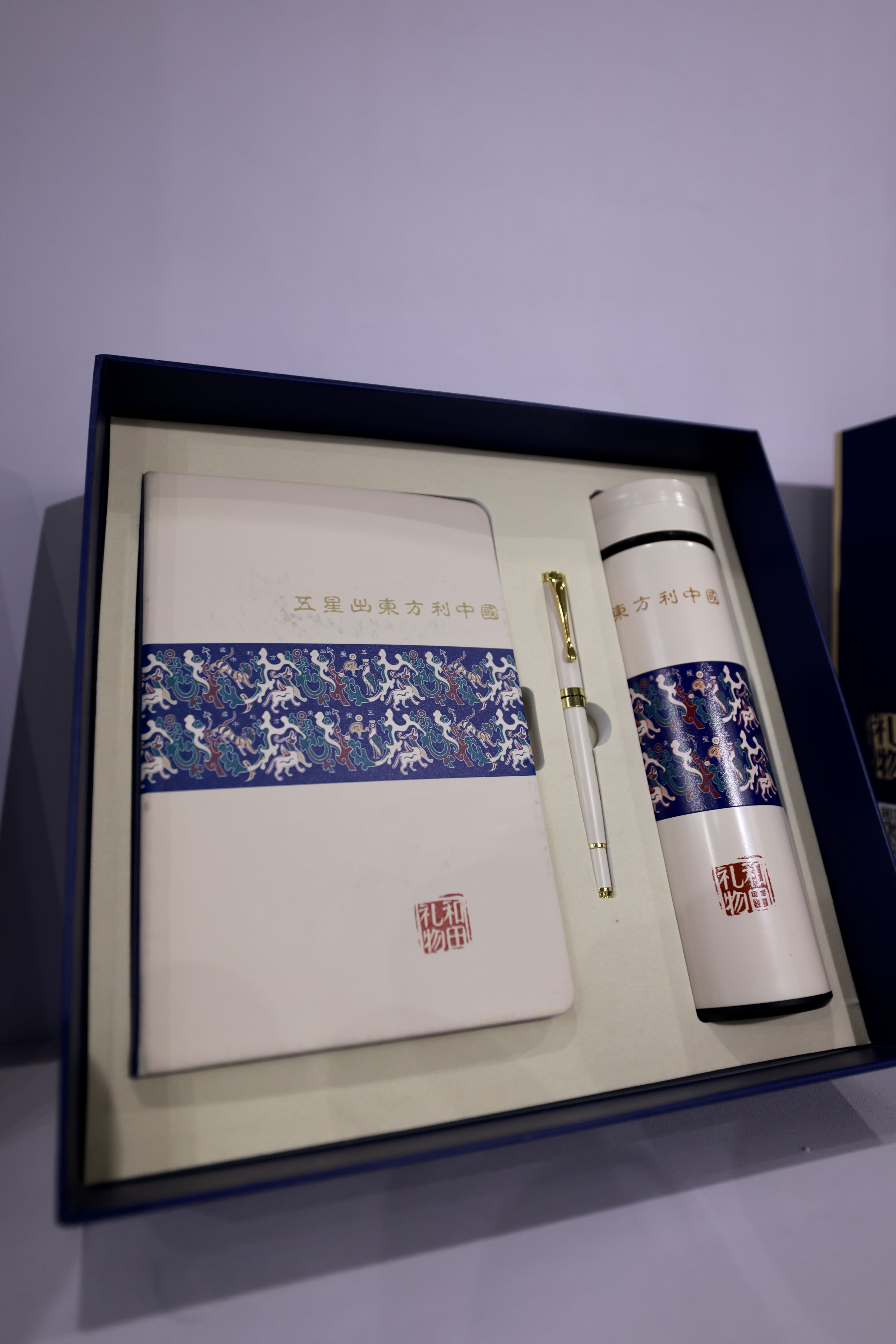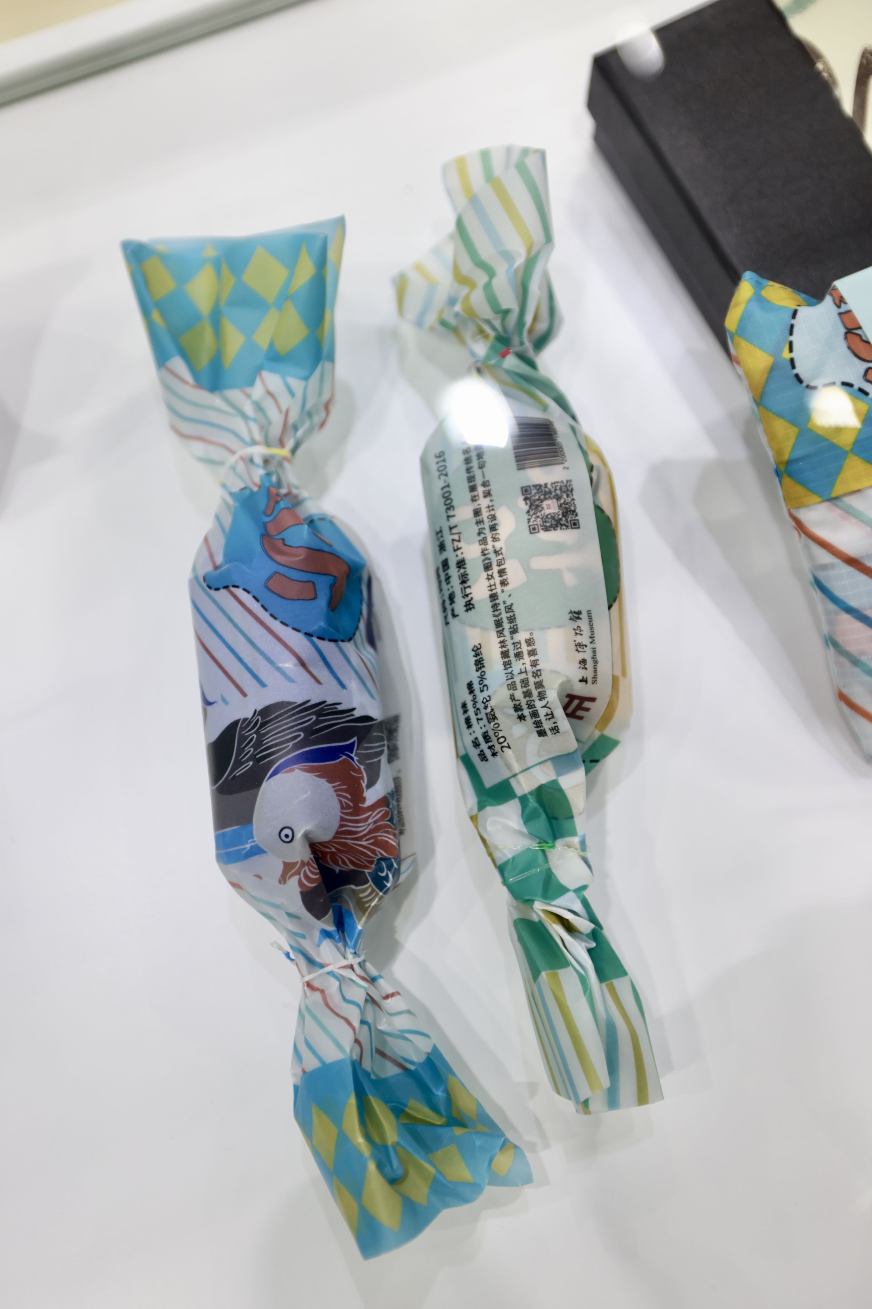 一系列周边文创产品也在现场展示,包括文件夹、双肩包、丝巾、茶具套装等。