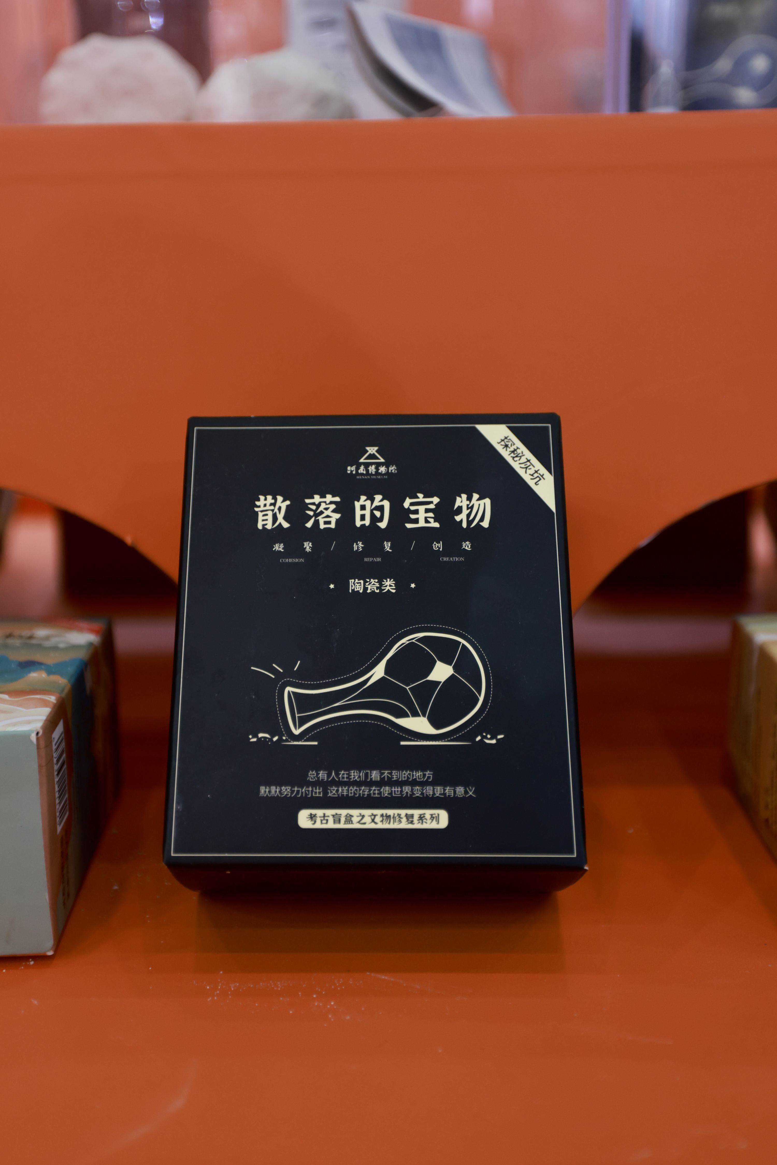 “豫来遇潮”文创品牌将现代国潮与中原地区传统文化相结合,旗下产品已有1000多款。展会上展示了“盲盒三剑客”——考古盲盒、修复盲盒以及传拓盲盒,还有古钱币巧克力、莲鹤方壶冰淇淋、国宝书签、四神云气幻影杯等。市民可以现场挖考古盲盒、观看修复文物。