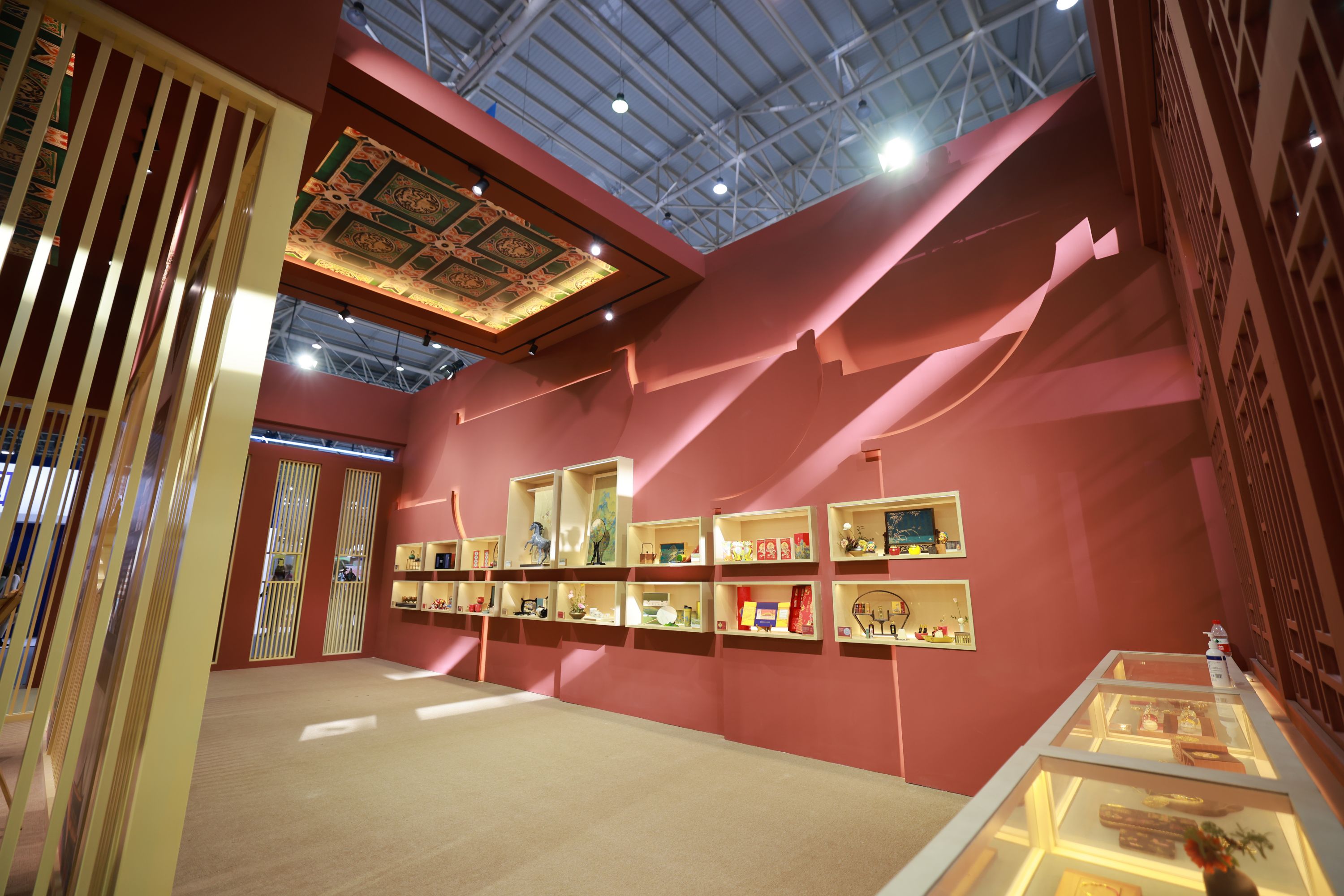 吉林省博物院展区设计环绕式展示架,带来其获奖文创萌萌系列暖手宝、树下听泉图纸雕灯等。