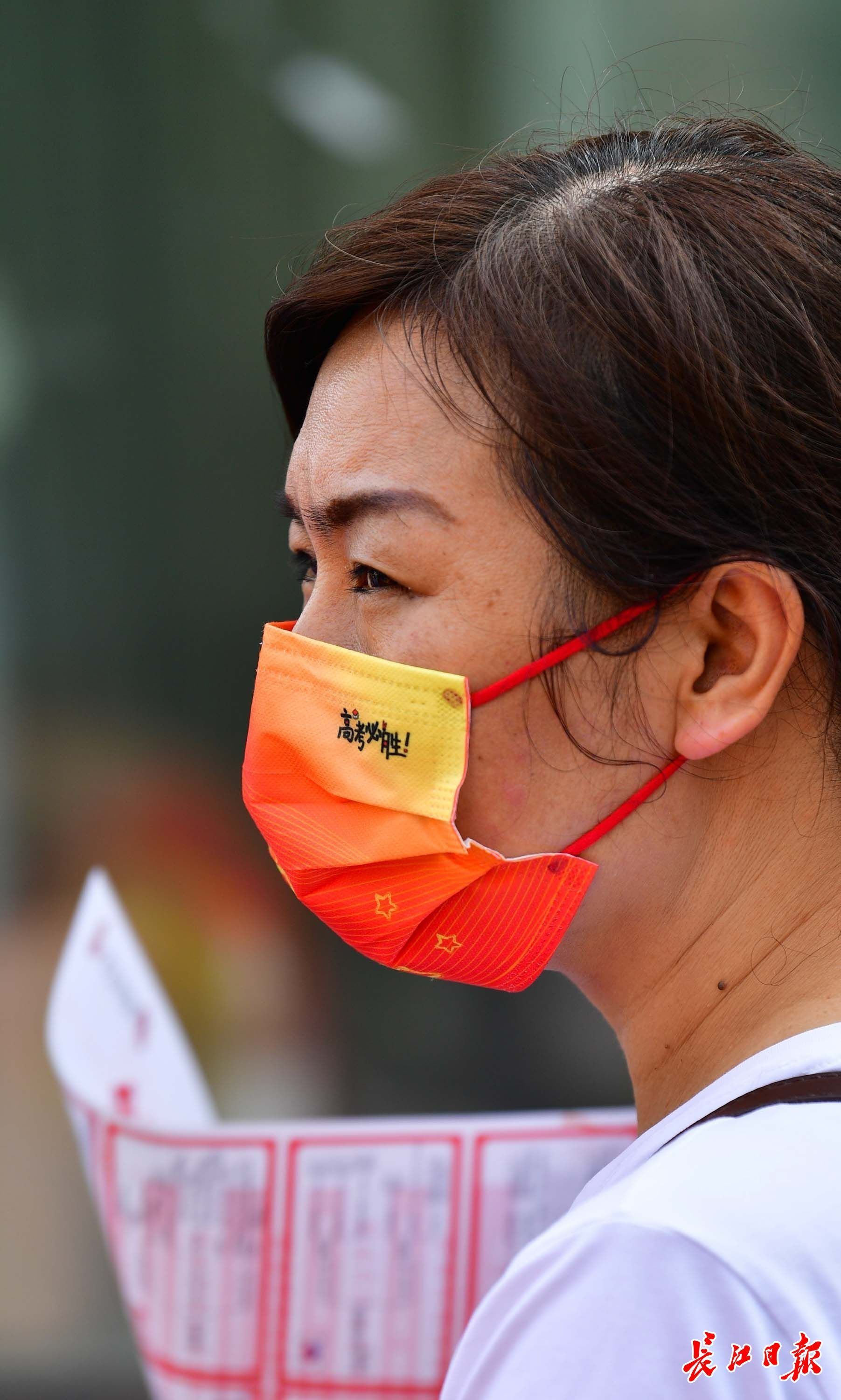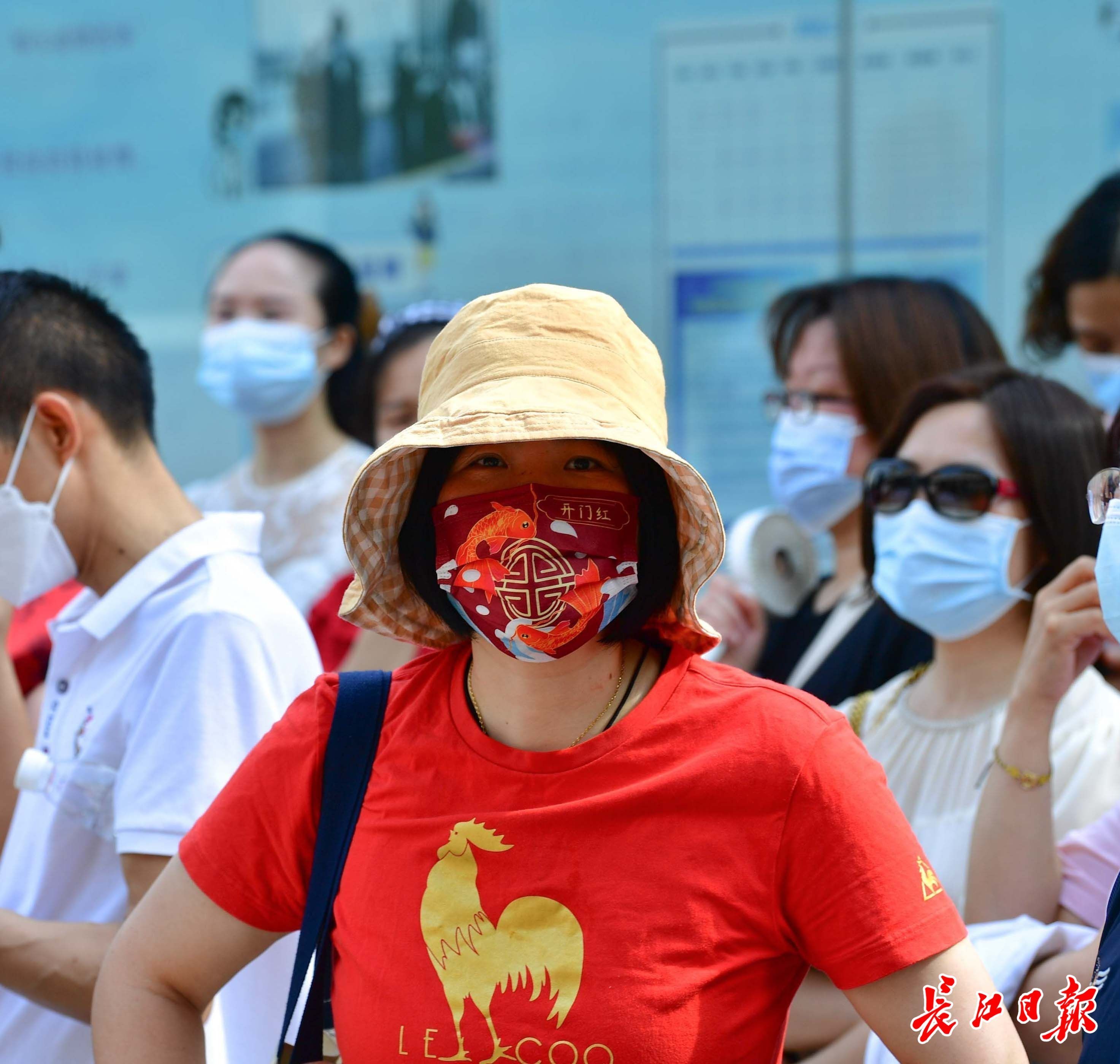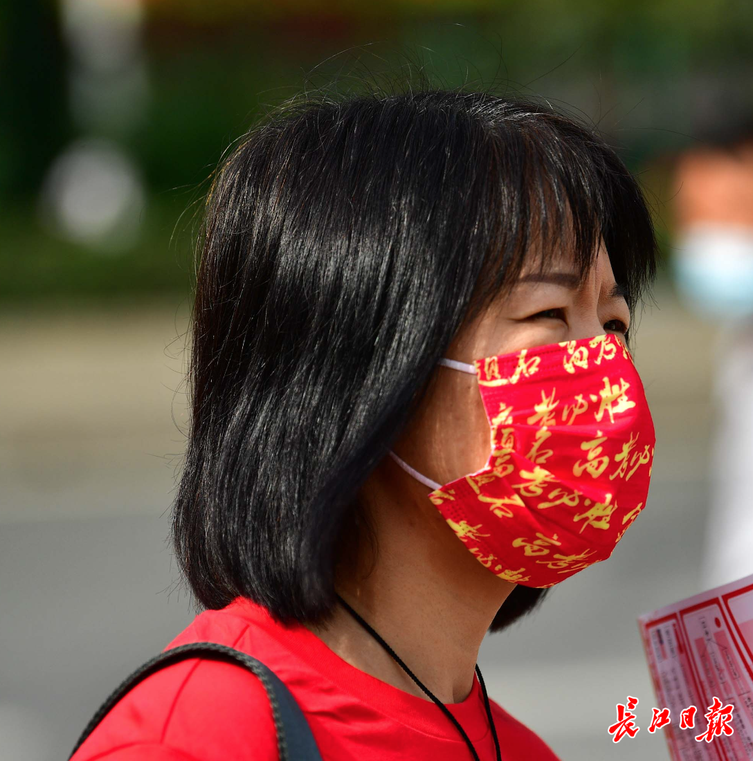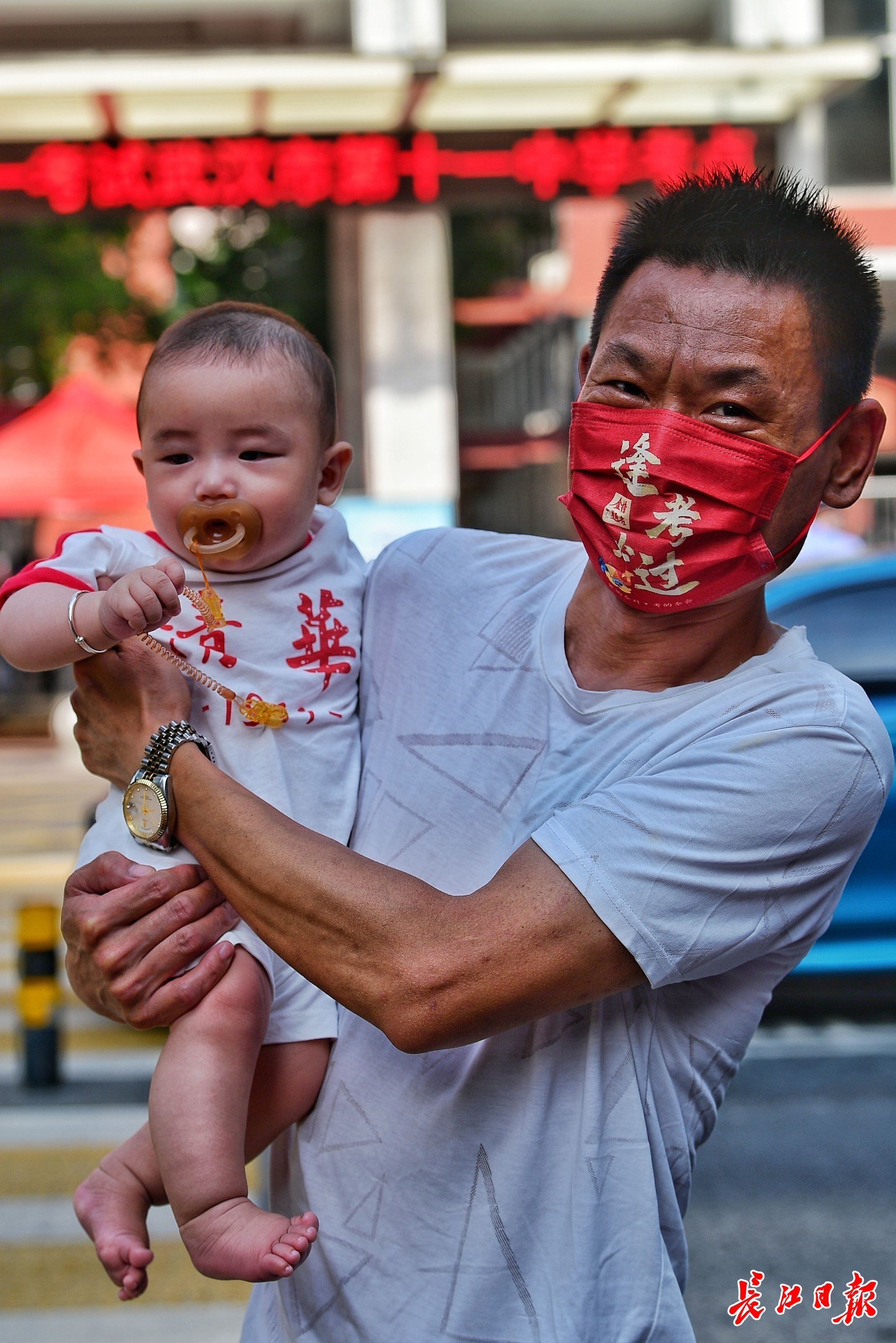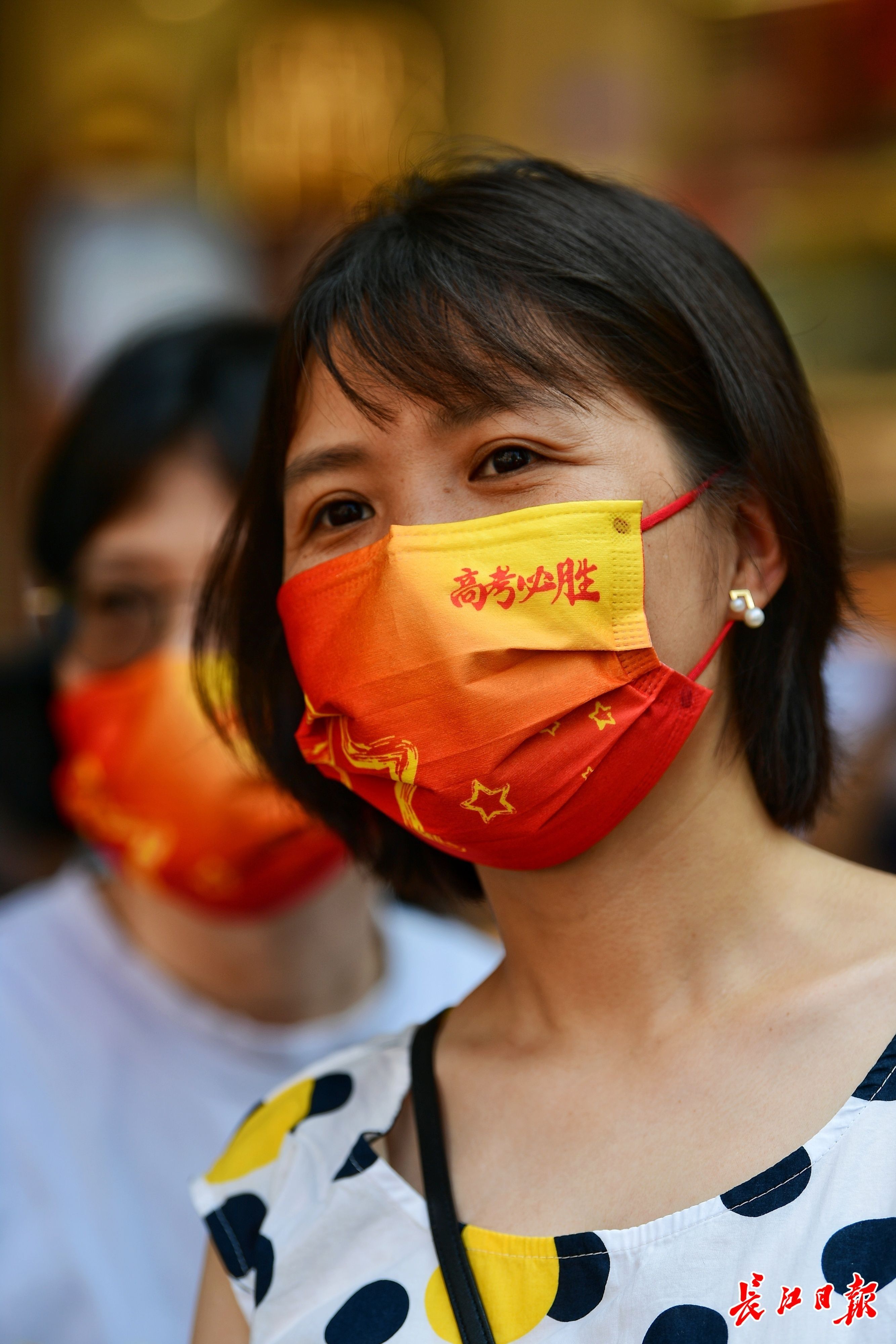 6月7日,高考首日,武汉市第二中学、武汉市第四中学、武汉市第十一中学和吴家山中学考点,送考家长戴着各种印有祝福的口罩,穿着印有祝福标语的服装,给孩子加油鼓劲,祝福他们高考取得好成绩。