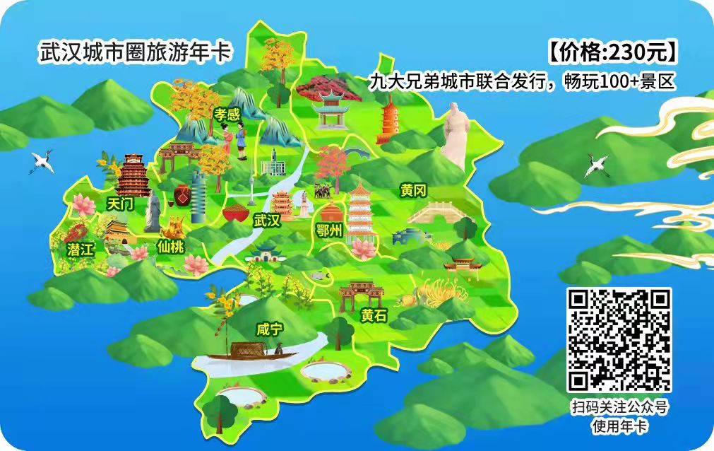 购买“武汉城市圈旅游年卡”后,游客可游览武汉市清凉寨景区、长江游轮“船长9号”、仙桃市百万花海风景区、黄州东坡赤壁风景区等多家优质景区,无论是悠闲地游览长江风光、体验江城情怀,还是探访惊险刺激的互动项目,都只需要一张年卡即可实现。据悉,游客购买激活年卡后,可在365天内游遍所有签约景区,来一场说走就走的省内游,目前景区名单正在逐步完善中。未来,“武汉城市圈旅游年卡”还将开发更多附加玩法,为游客开启“2小时直达、游遍九城”的省心模式,带动旅游周边产业发展,促进九城旅游市场繁荣发展。感兴趣的市民游客可关注公众号“武汉城市圈旅游年卡”咨询购买。