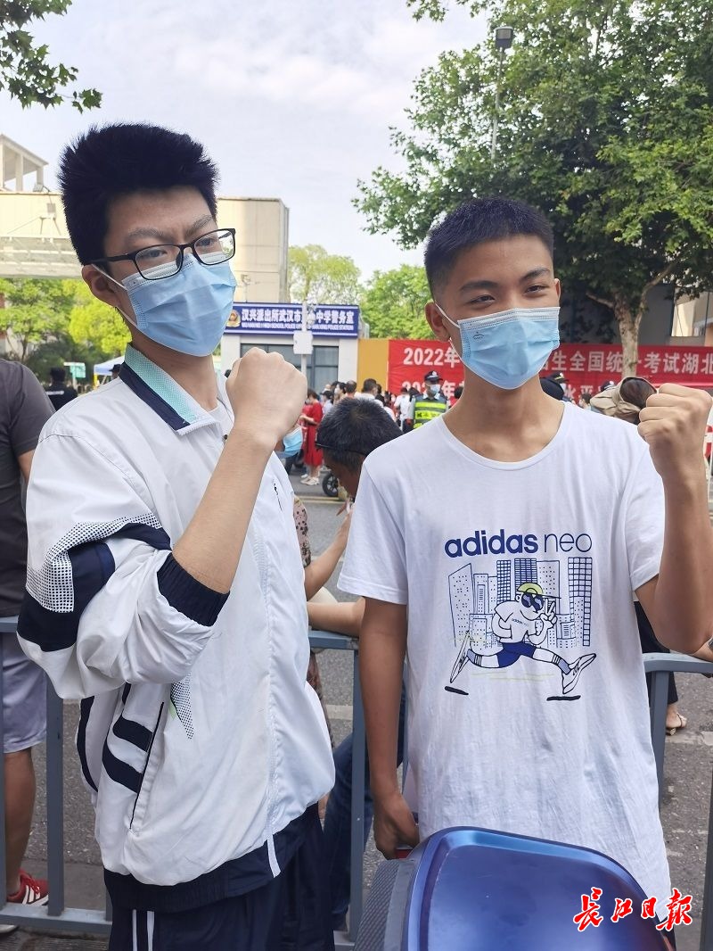 这两名高二男生是武汉一中的学生刘永胜和武汉市第十二中学的刘胤。他们是小学同学,也是多年好友,两人昨晚约定好一起来高考考点外看看,感受高考气氛,激励自己。