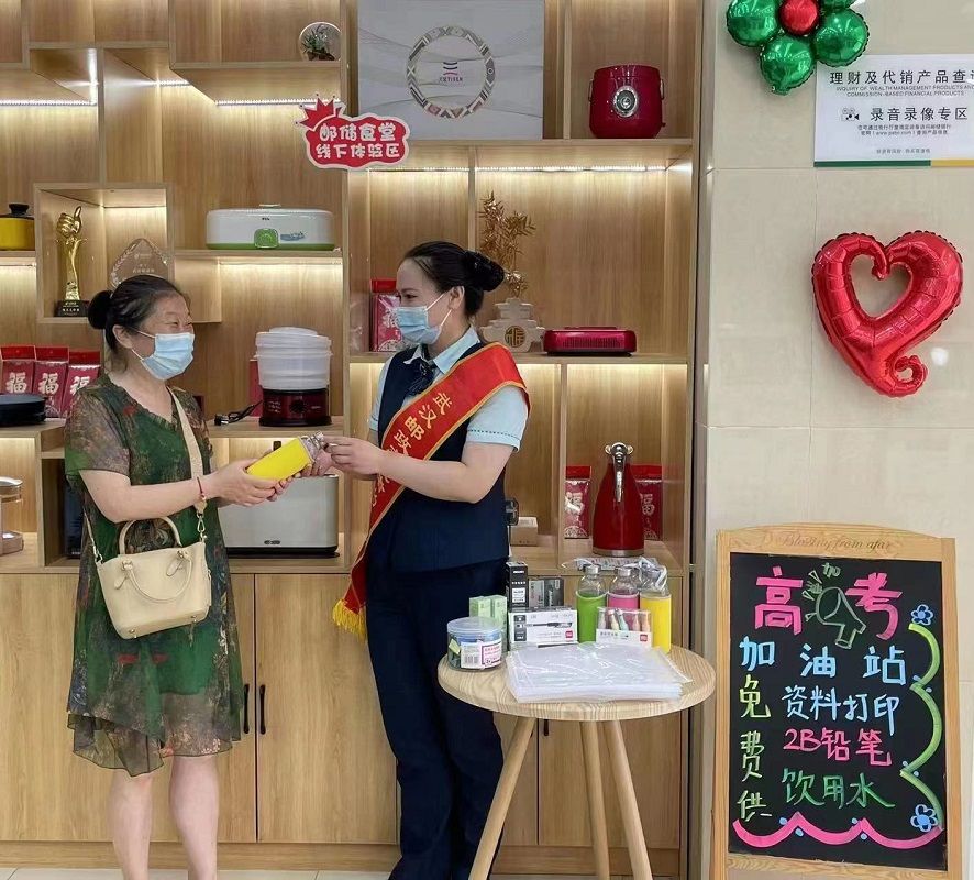 网点经理方凌峰说:“在网点大厅等候区域,我们专门开辟了高考休息区,为陪考家长提供休息纳凉场地。不仅配备了舒适的休息桌椅,还有免费Wi-Fi可以使用。”高考首日天气炎热,网点工作人员还来到考点附近,为陪考家长送上便携小风扇、风油精等防暑降温物品。