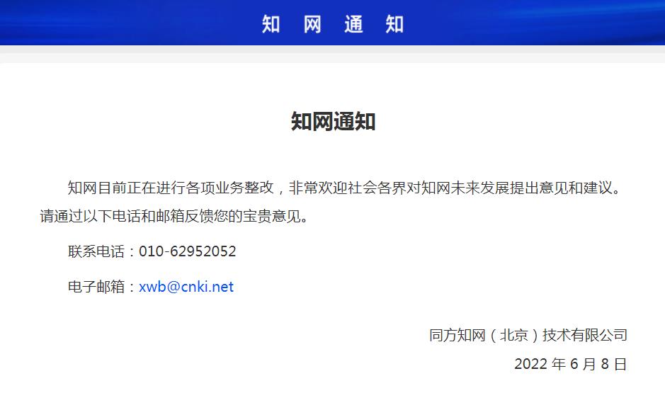 长江日报大武汉客户端6月9日讯(记者李玉莹)6月8日知网方面发布“通知”:知网目前正在进行各项业务整改,欢迎社会各界对知网未来发展提出意见和建议。