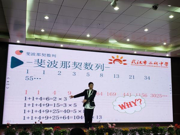 比赛过程中,七(2)班的芦沐阳、沈子熙、邹鑫喆、李程旭四位同学通过热情洋溢的演讲,介绍了斐波那契数列的深层奥秘。“这个数列从第三项开始,每一项都等于前两项之和。”芦沐阳讲道,从自然界里的兔子繁殖规律到向日葵的螺旋、菠萝表面的凸起,斐波那契数列广泛存在于动植物中,这也引导我们在数学的世界中学会如何思考,明白了数学学科三个最重要的内容:计算、应用与激发灵感。
