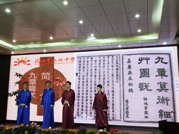 长江日报记者在现场看到,一些耳熟能详的数学知识定理在加入创新的故事情节后,变得不再枯燥乏味。七(3)班的钱文康、张朝阳、陈明琪、胡棋糯四位同学身穿长衫,面带微笑,向观众挥手致意,用诙谐的相声语言讲解《九章算术》的形成史。