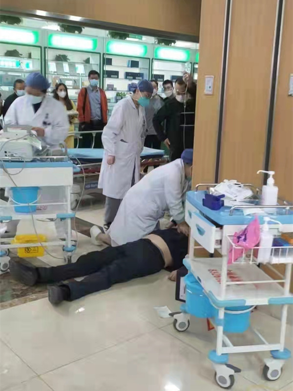 王甜甜发现李先生意识不清、大动脉搏动弱、呼吸弱,双侧瞳孔对光迟钝,于是沉着冷静地就地实施了心肺复苏。3分钟后,其他急诊科医护人员也推着除颤仪等抢救设备来到现场,对李先生实施了电除颤、建立静脉通道等急救措施,并分次为其静脉注射肾上腺素,其间在岗的医护人员轮番上阵持续为李先生进行胸外按压,所有抢救工作都有条不紊地进行。