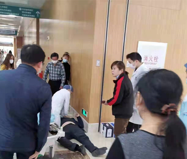 “谁知紧急情况发生了!”12时10分左右,李先生路过门诊药房时突然感觉到胸部剧烈疼痛,将手上提的东西放下后,便倒地不起且出现抽搐症状。周围人纷纷停下脚步,正在附近的一名医学生注意到情况后立刻上前查看,发现李先生意识不清,随即快速跑向急救科呼叫救援:“有个患者在药房过道晕倒了!”听闻情况,急诊科王甜甜医生立刻赶到了李先生身边,整个过程监控显示不到30秒。
