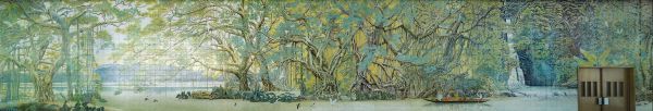 首都机场第一幅壁画是祝大年1979年创作的《森林之歌》,在3000多片瓷板上用粉彩描绘烧制而成,表现“春回大地”的主题。