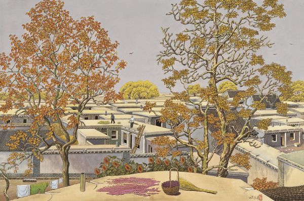 祝大年1970年代创作的工笔重彩《李村秋实》,尺寸82.5×125.5cm。