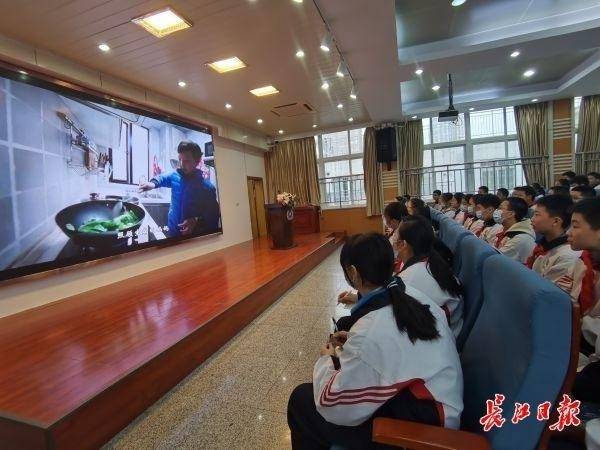 在武汉市第十九初级中学,少先队员们收看江汉区榜样公开课。(记者刘嘉 摄)