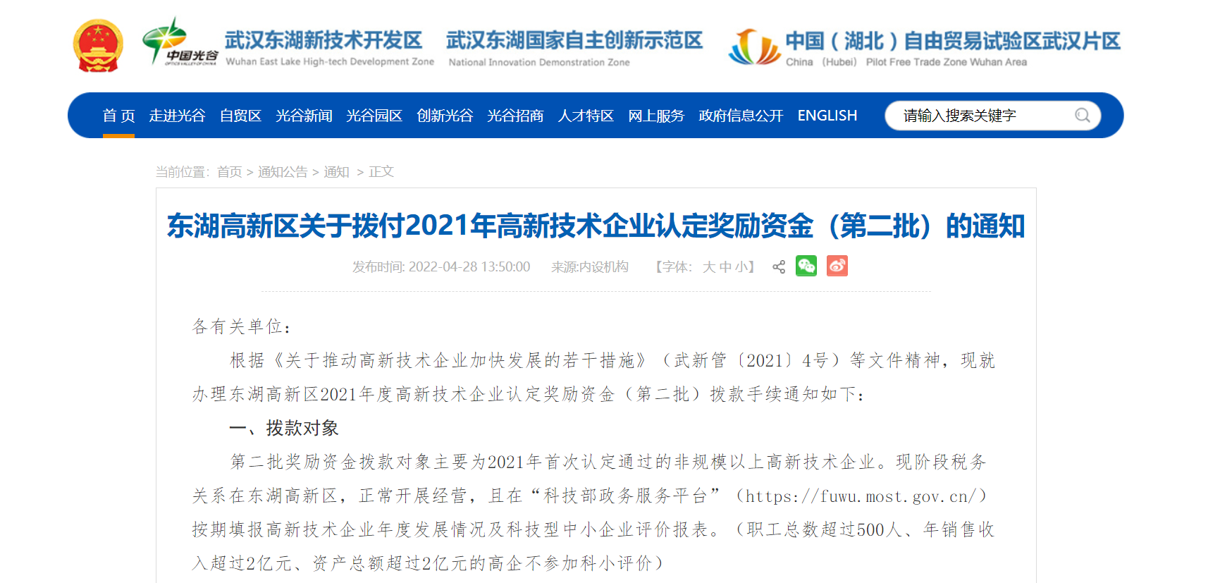 东湖高新区官方网站公告。东湖高新区科创局供图