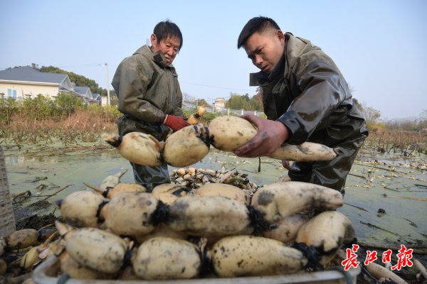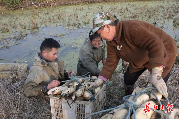 下午3时许,李家父子将整理好的藕装了3大筐,抬到藕塘边的空地上,中国太平洋财产保险股份有限公司湖北分公司工作人员也将货车开到这里,方便上货。