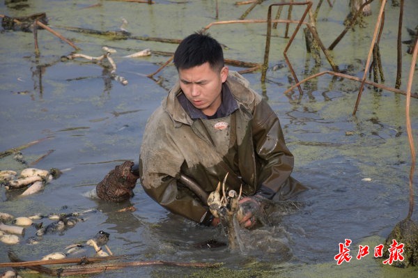 12月8日,李家和父亲李古军在藕塘里为爱心企业订购的莲藕而忙碌着。记者詹松 摄