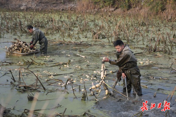 12月8日,李家在藕塘里为爱心企业订购的莲藕而忙碌着。记者詹松 摄