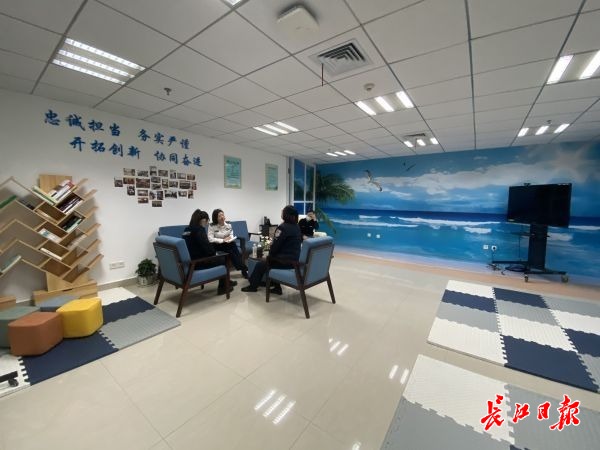 长江日报大武汉客户端12月9日讯 在武汉天河机场T3航站楼的一间办公室里,藏着另一番小天地。蓝色大海背景墙、松软的沙发、优柔的音乐、木质书架……能让人立刻放松下来。这里是刘欣开展心理疏导的地方。