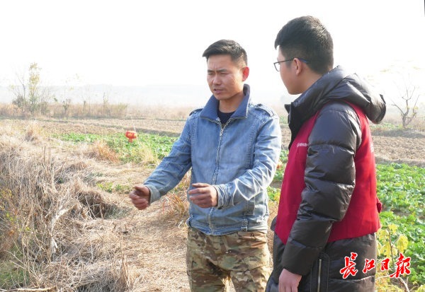 金都购物中心(祁家湾店)工作人员来到李家的藕塘旁了解李家家庭情况以及莲藕供货情况。 记者詹松 摄