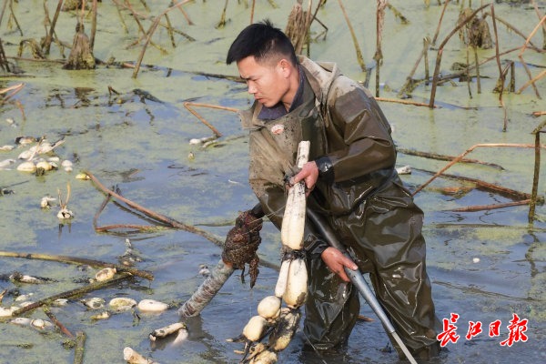 冬寒刺骨,但几天来李家一直在藕塘忙着采收莲藕。 记者詹松 摄