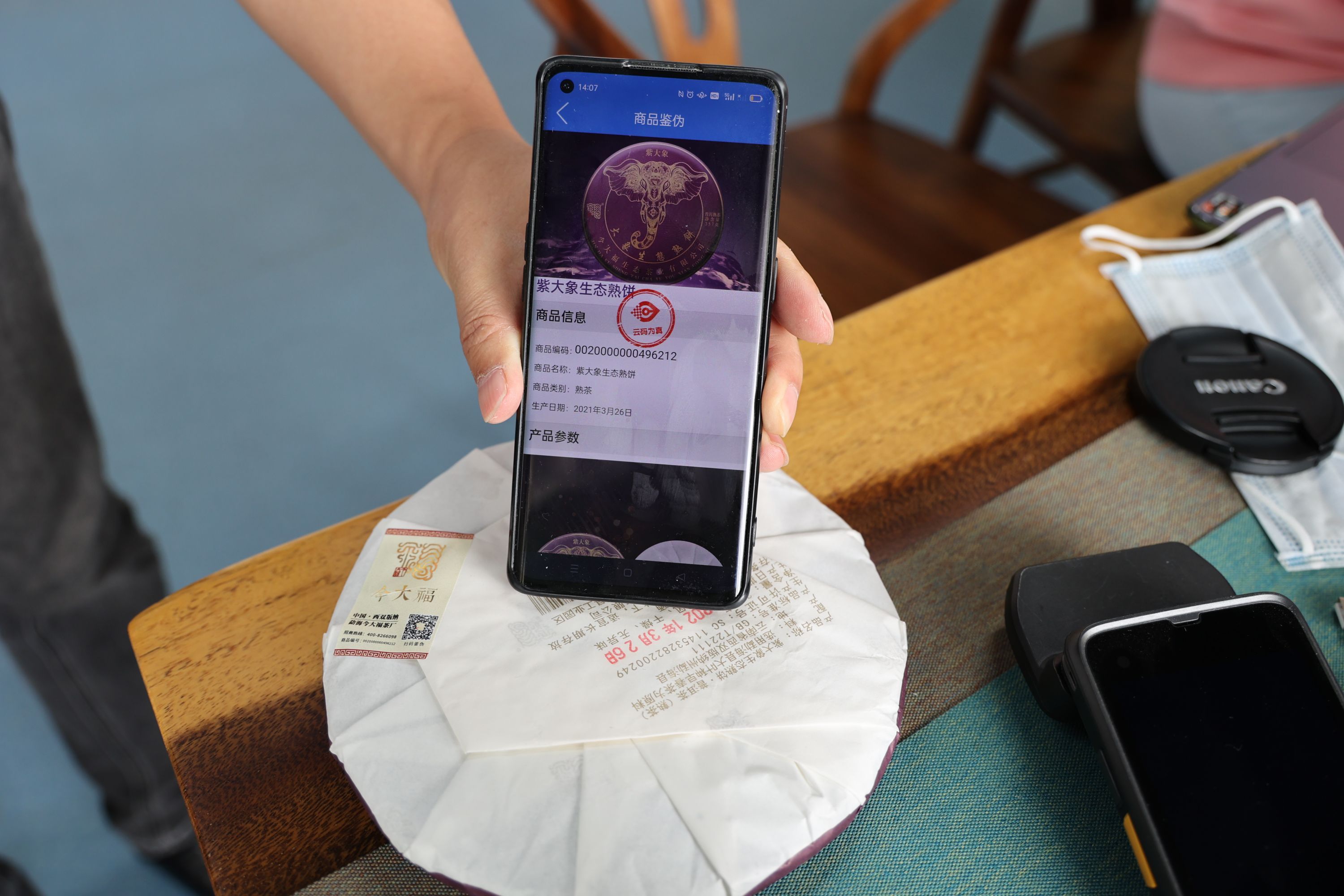 手机APP可识别茶饼上的云码。东湖高新区融媒体中心供图