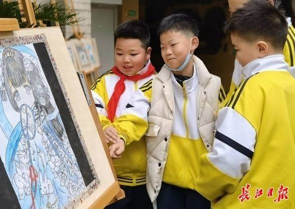 学生们围观优秀美术作品。(记者向洁 摄)