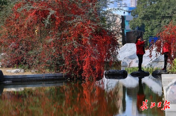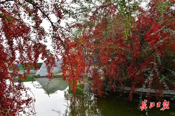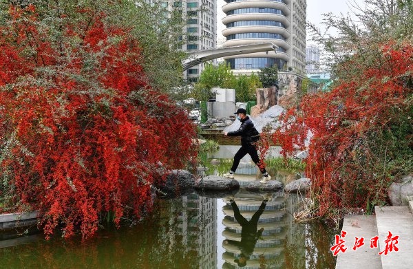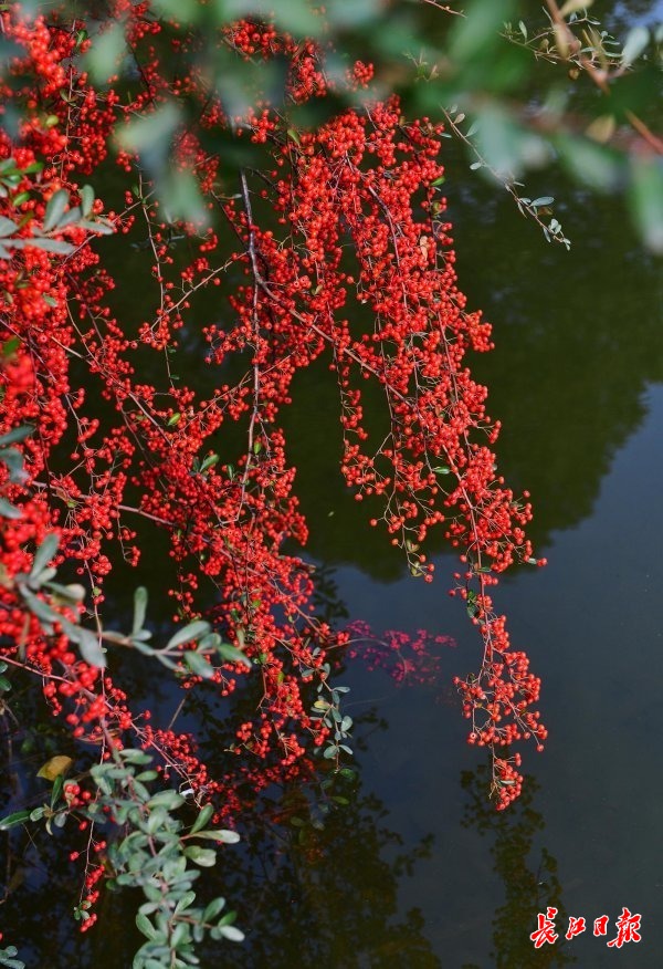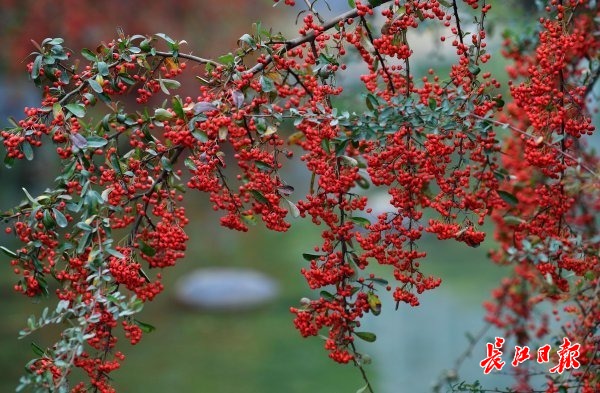 12月15日,汉口江滩三峡石广场,浅池旁几株火棘繁盛的枝丫上挂满了红彤彤的小果子,累累果实压弯了枝条,犹如一串串红宝石挂在水边。时至冬日,火棘的叶子变得灰暗且脱落了一些,红果显得愈发繁多密集,交织在一起垂成帘、铺成网,远看更像挂在池边的红色“瀑布”。