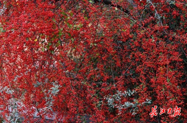 火棘是蔷薇科苹果亚科的常绿灌木,春季盛开精致的小白花,花量巨大,秋、冬季果实变红,颜色格外醒目,是既能赏花又可观果的优良绿化植物,在武汉也较为常见。火棘还有个俗名叫救军粮,意指其果实磨成粉可作代食品。(长江日报记者 李永刚 摄)