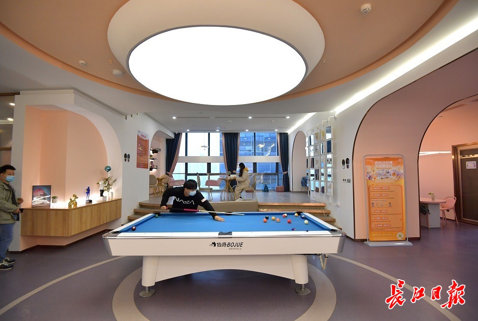 活动区的正中间,摆放着一个台球桌,几名青年正在桌前挥杆激战;台球桌左边,是由一圈彩色沙发自然合围着的影音室,右边是有着三层台阶的休闲区,可招待朋友喝茶聊天;再往后是放有粉色长条桌的多人会议室,可玩桌游或畅谈创业计划;会议室紧邻着共享厨房,常有小伙伴在这里一展厨艺。顺着台球桌往前是健身房,内有跑步机和健身器。公共活动区可通往屋顶露天球台,有女孩正在冬日的阳光下,靠着休闲椅晒太阳,看书。
