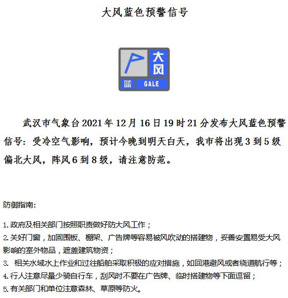 今天19时21分,武汉市气象台发布大风蓝色预警信号:受冷空气影响,预计今晚到明天白天,我市将出现3到5级偏北大风,阵风6到8级,请注意防范。