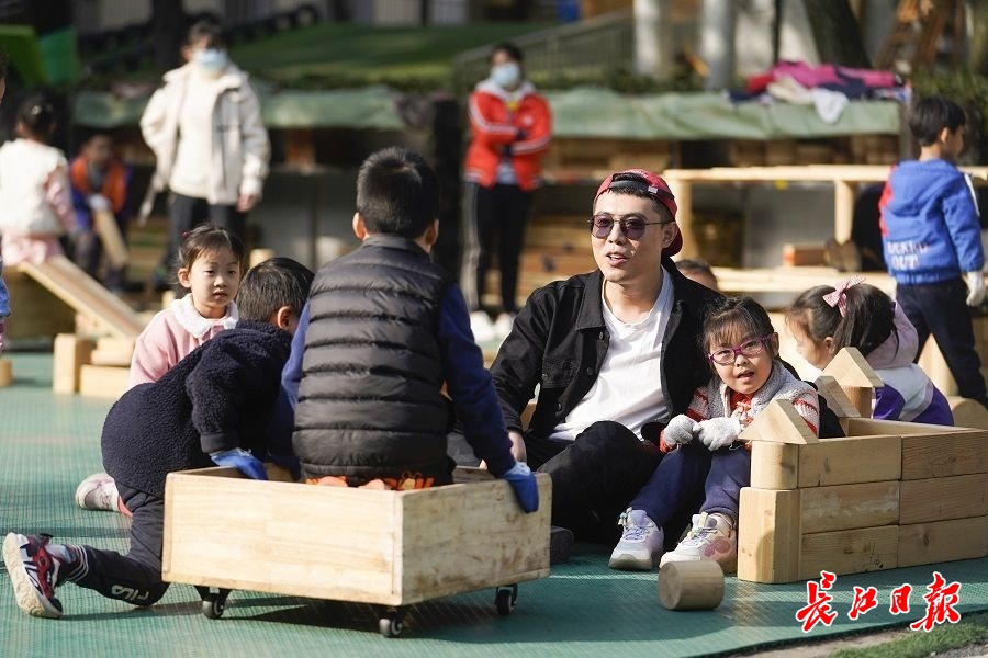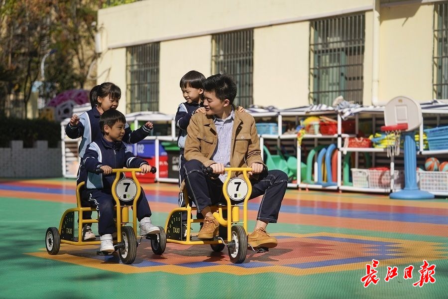 阳光下,湖北省省直机关第一幼儿园老师杨晓龙和孩子们一起做游戏。