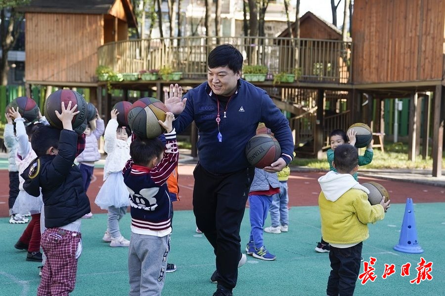 武汉市实验幼儿园橡树园区,90后男幼师张俊夫带着孩子们玩起篮球游戏。