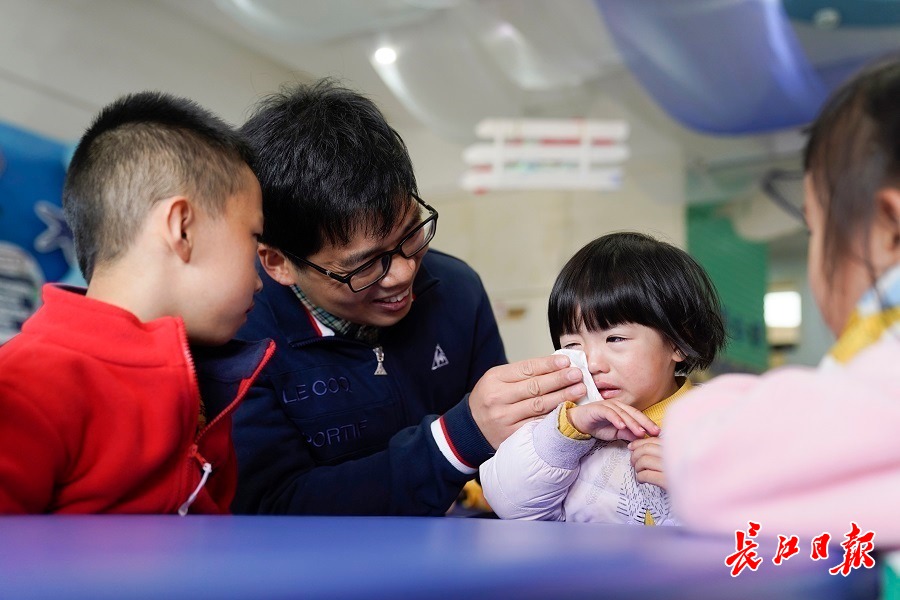 武汉市实验幼儿园的男教师熊立群安慰一名哭泣的小朋友。
