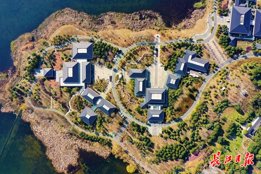 鸟瞰汤湖工人文化宫被各种植被包围。