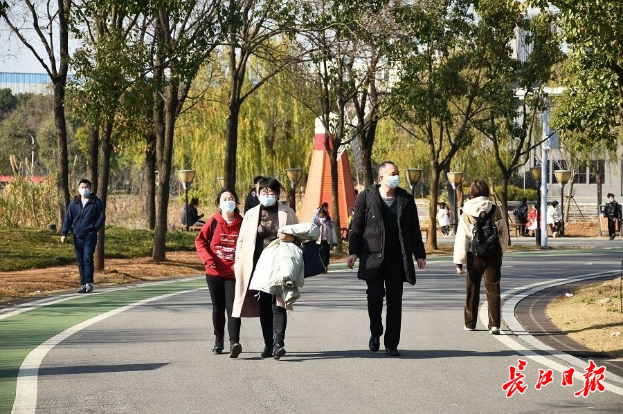 市民打卡汤湖畔,享受冬日暖阳。