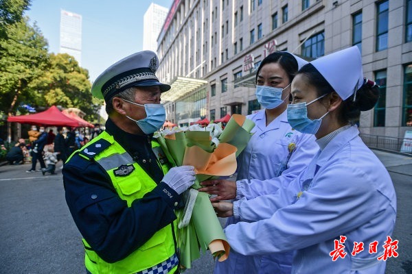 12月22日,武汉市儿童医院的医护人员给陈立新送来鲜花。 长江日报记者史伟 通讯员唐时杰 摄