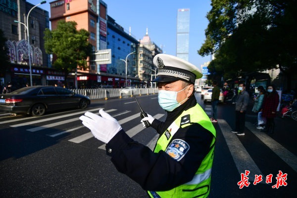 12月22日,在武汉市儿童医院门前,身穿黄色反光背心的交警陈立新在指挥过往车辆和行人。 长江日报记者史伟 通讯员唐时杰 摄