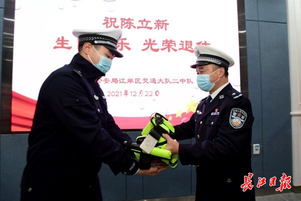 22日中午,江岸区交通大队二中队的全体在队民警辅警为陈立新举行了简短而隆重的荣休仪式,向他致敬。仪式上,陈立新慢慢取下陪伴了自己40年的警用装备,双手交给新参警民警刘旭。“希望你继承和发扬优良传统,今后做得比我更好!”现场全体战友起立向他敬礼。