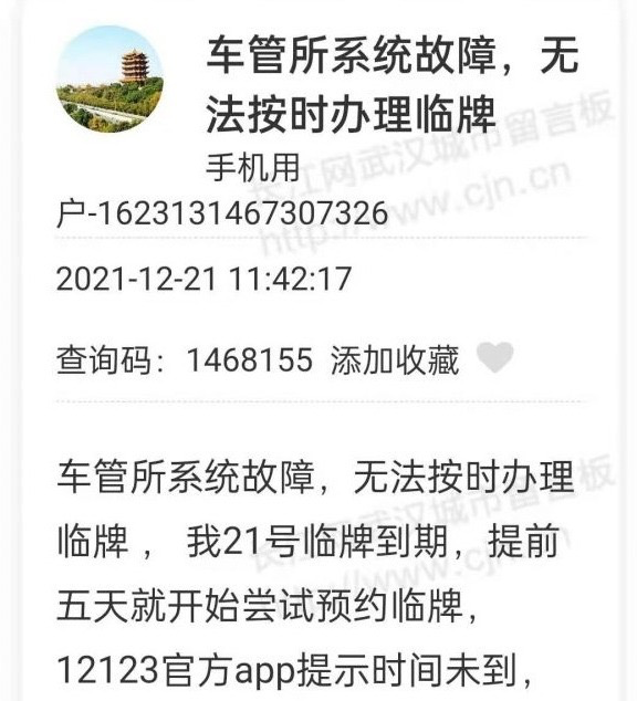 长江日报大武汉客户端12月22日讯(记者李爱华 实习生陈栎 杨豆豆)本月21日新车临牌到期,提前在12号就开始网上预约办理续期,12123APP却提示18日前无法办理。近日,一位市民在武汉城市留言板留言,怀疑网站系统出现故障,导致自己无法按时办理临牌,交管部门回复表示,因该车上一次核发的临时号牌有效期到今年12月21日,故系统设定规则下需在12月18日后再为该车申请临时号牌。当事人申请新车临牌业务已于20日受理,临牌于21日已邮寄发出。