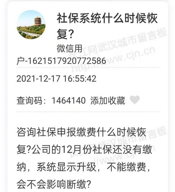 长江日报大武汉客户端12月26日讯(记者李爱华 实习生陈栎 杨豆豆)系统显示升级不能缴费,社保如何补缴?工作变动后社保卡无法使用,如何办理?近日,多位市民在武汉城市留言板留言,咨询社保相关问题,人社部门均及时给予了回复。