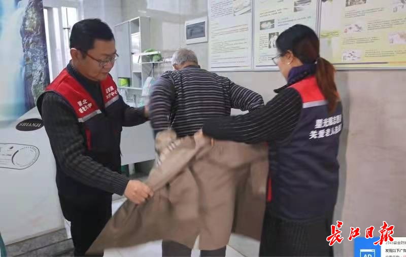 武汉志愿者助浴师为老人脱衣助浴。通讯员程春亭 供图。