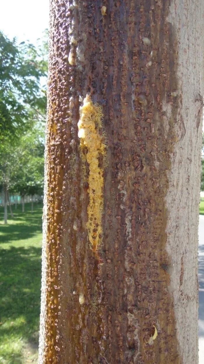 合欢幼苗和大树均可感病,多发于长势较弱植株。表现为整株叶片萎蔫、变黄、脱落,枝条枯死,前后过程仅几天时间。树皮出现纵列伤口,病叶发酵的白色泡沫溢出。主干断面可见一整圈变色环,树根部断面呈褐色或黑褐色。