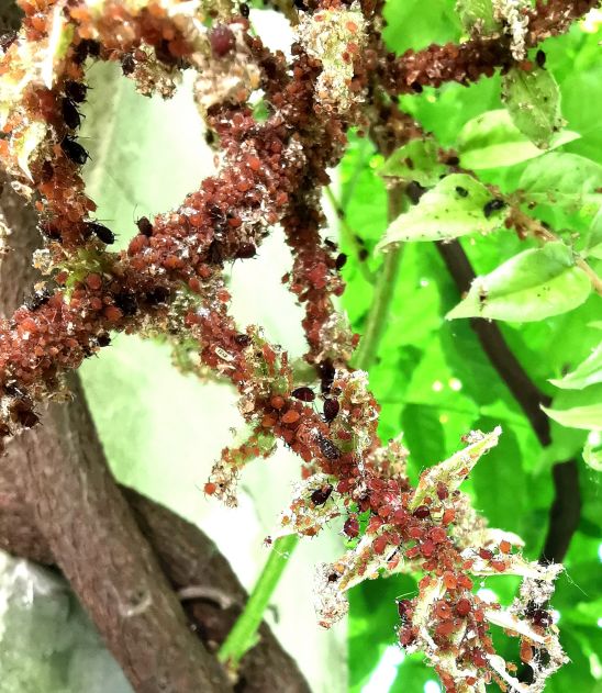 蚜虫仍是近期害虫防治的重点,目前蚜虫种群数量暴增,危害加重,已开始引发各种植物的煤污病,并造成植物叶片、嫩芽的畸形。