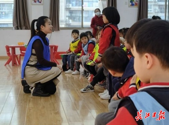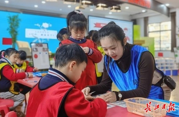 南垸坊小学程倩老师带幼儿游历“数学乐园”。(记者向洁 摄)