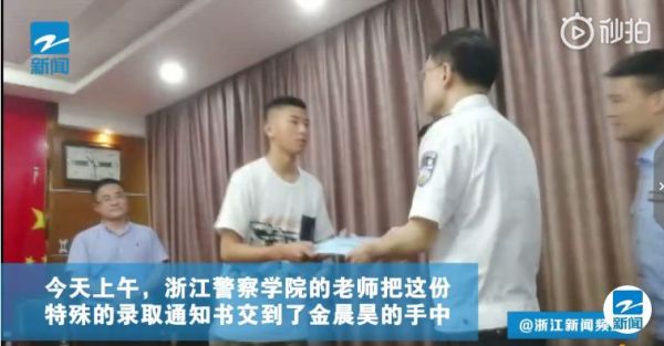 去年9月,杭州民警金健勇连续工作48小时,突发脑溢血。他和病魔抗争257天后停止了呼吸。今年高考,金健勇的儿子金晨昊考上了浙江警察学院。近日,小金收到了学校发出的第一张录取通知书,编号001。