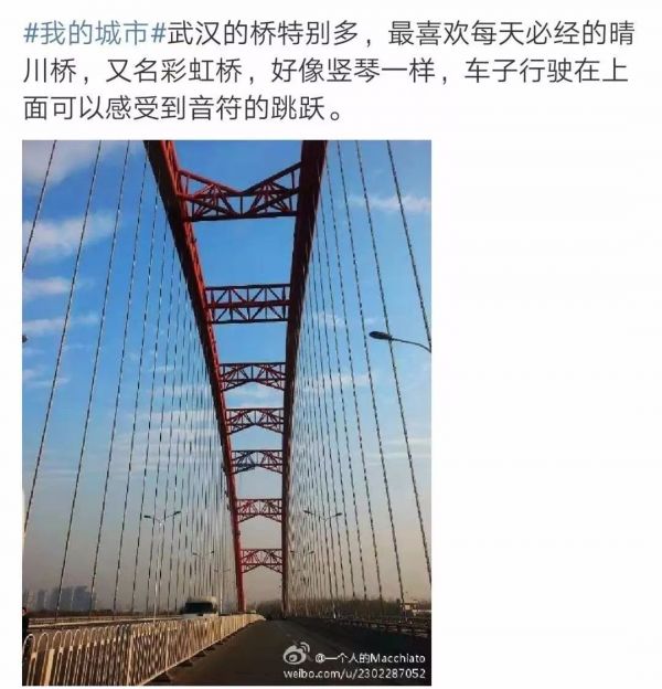 ◇ 武汉的晴川桥被不少市民亲切地称为彩虹桥,但桥身却是红色的,能否将桥身刷成彩虹色?近日,网友陈先生在长江网武汉城市留言板提出这一“奇思妙想”。武汉市城市运营公司回复:网友对武汉的热爱,让我们很感动。但晴川桥颜色需要和其他几座桥梁在整体上保持协调性,不能随意更换。